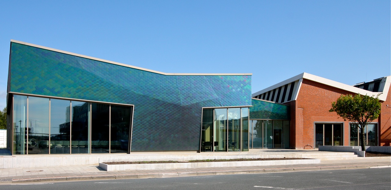 - Die Fassade besteht aus geprägten Edelstahlschindeln und bildet eine Analogie zur geschuppten Fischhaut